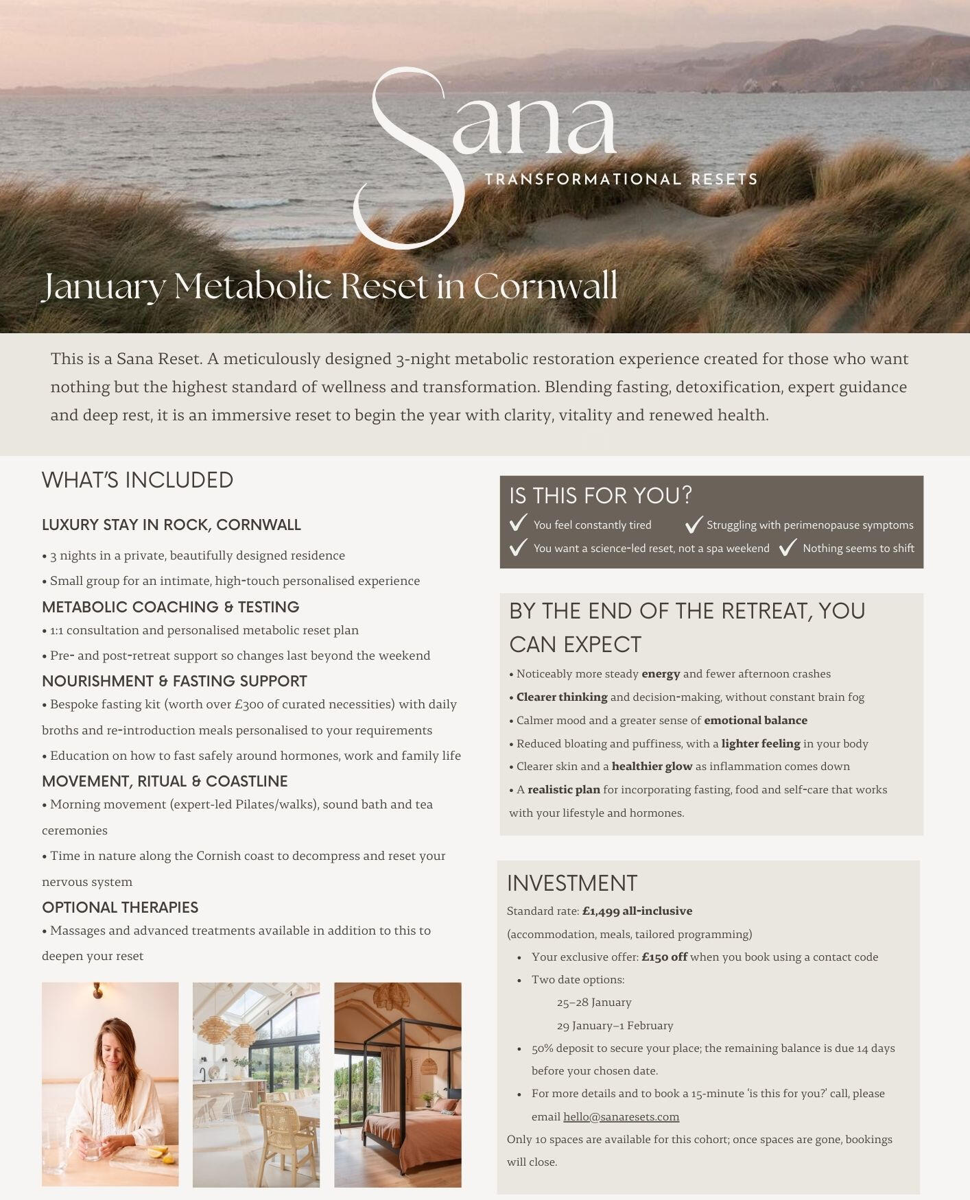 Unlike traditional retreats that focus on spa treatments, movement and mindfulness alone, Sana is built on the understanding that true transformation happens at a biological level, where metabolic healing, detoxification, and nervous system repair take place.Our bespoke metabolic restoration resets are designed to strip away the stress, toxins, and overstimulation of modern life, leaving you with clarity, vitality, and a renewed sense of self.